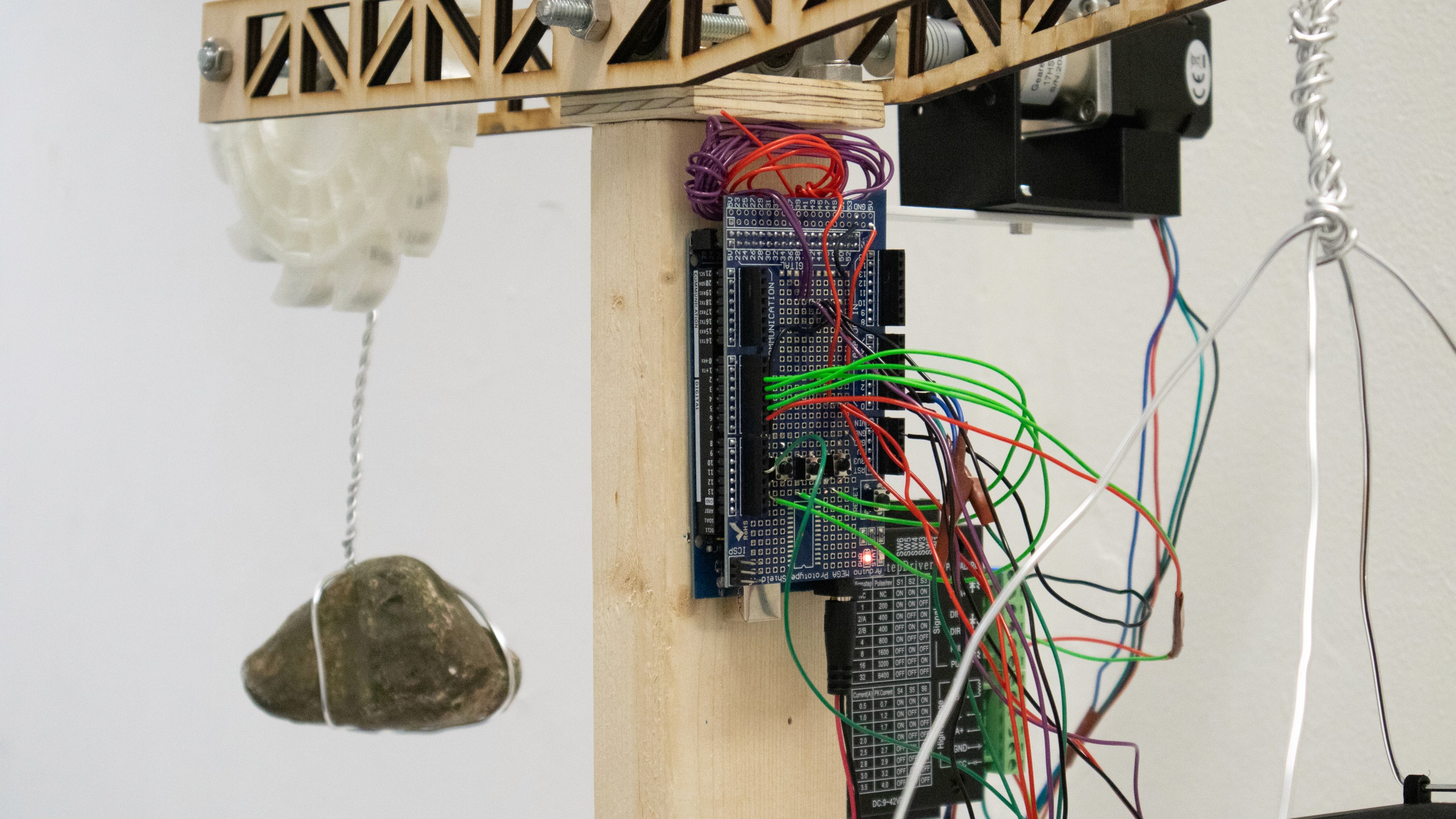 Unexpectedly, the rock slowly rises whilst the smartphone descends. This inverted movement reflects the density of minerals extracted from the earth and embedded within the device. The movement is controlled by a geared stepper motor, and the degree of movement is determined by readings from magnetic sensors installed beneath the tray.