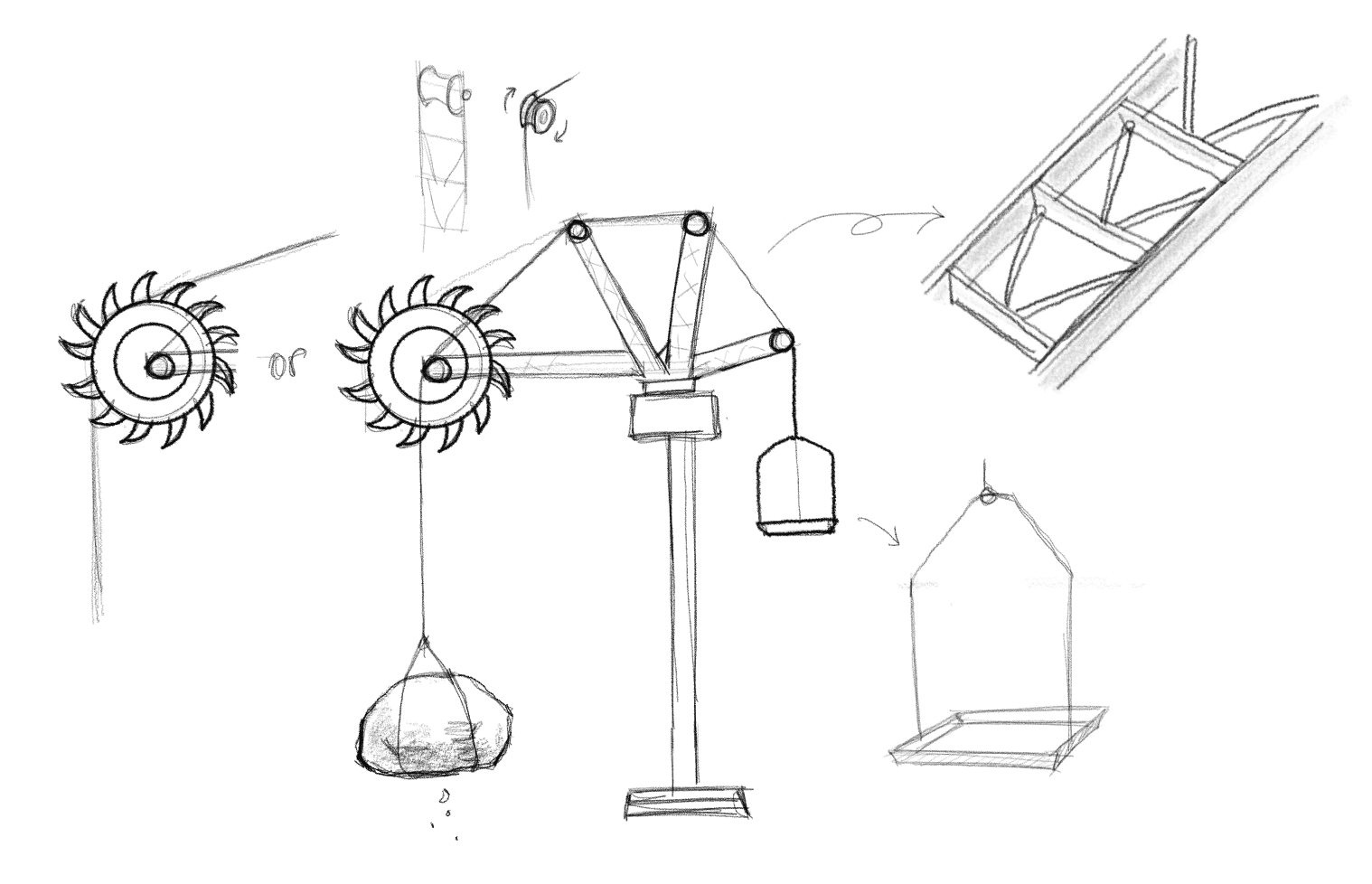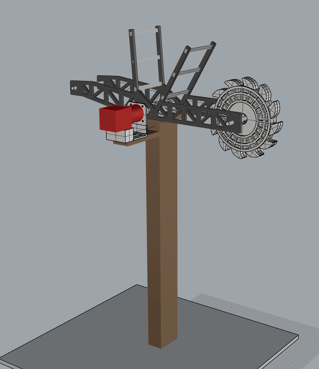 The arms holding the rock and tray were designed in Rhino 3D and laser-cut from 6 mm plywood (Figure 20). On the rock side, 3D-printed bucket-wheel props rotate slightly as the arm moves up and down. Steel balls were placed inside the buckets to produce a satisfying sound and to shift weight naturally, without requiring an additional motor.