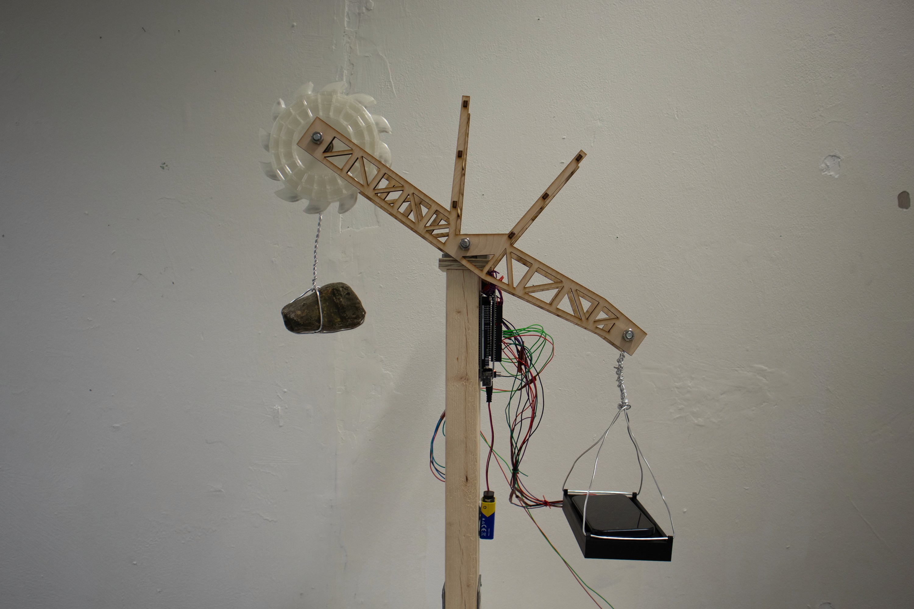 Based on this research and critical reflection, I decided to create an interactive scale installation. It takes the form of a traditional weighing scale. On one side, a rock hands as a counterweight, on the other side, a tray is provided for visitors to place an object. The visitor is invited to take their smartphone out of their pocket, place it on the tray, and observe what happens.