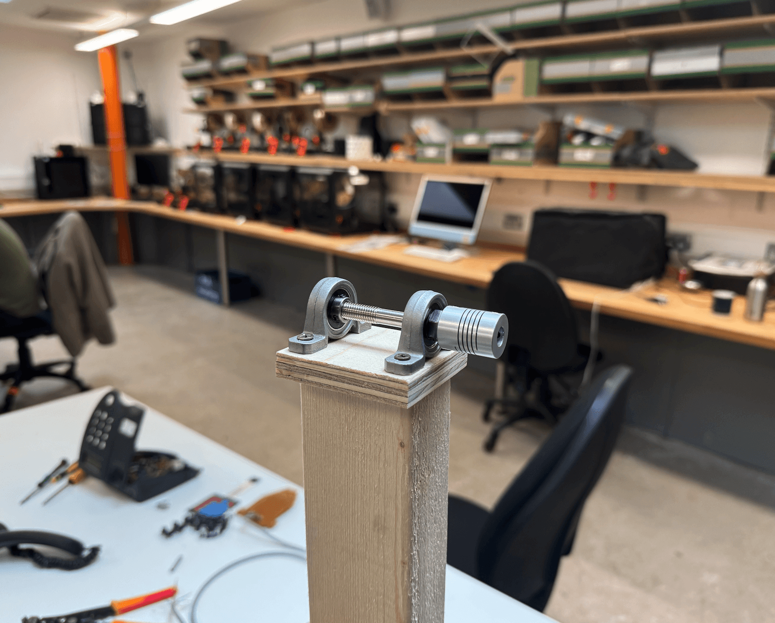 The build began with a long timber piece as the main upright. Two pillow block bearings were mounted on top to fix a shaft in place, and this shaft was connected to the motor via a coupler (Figures 5.1, 5.2).