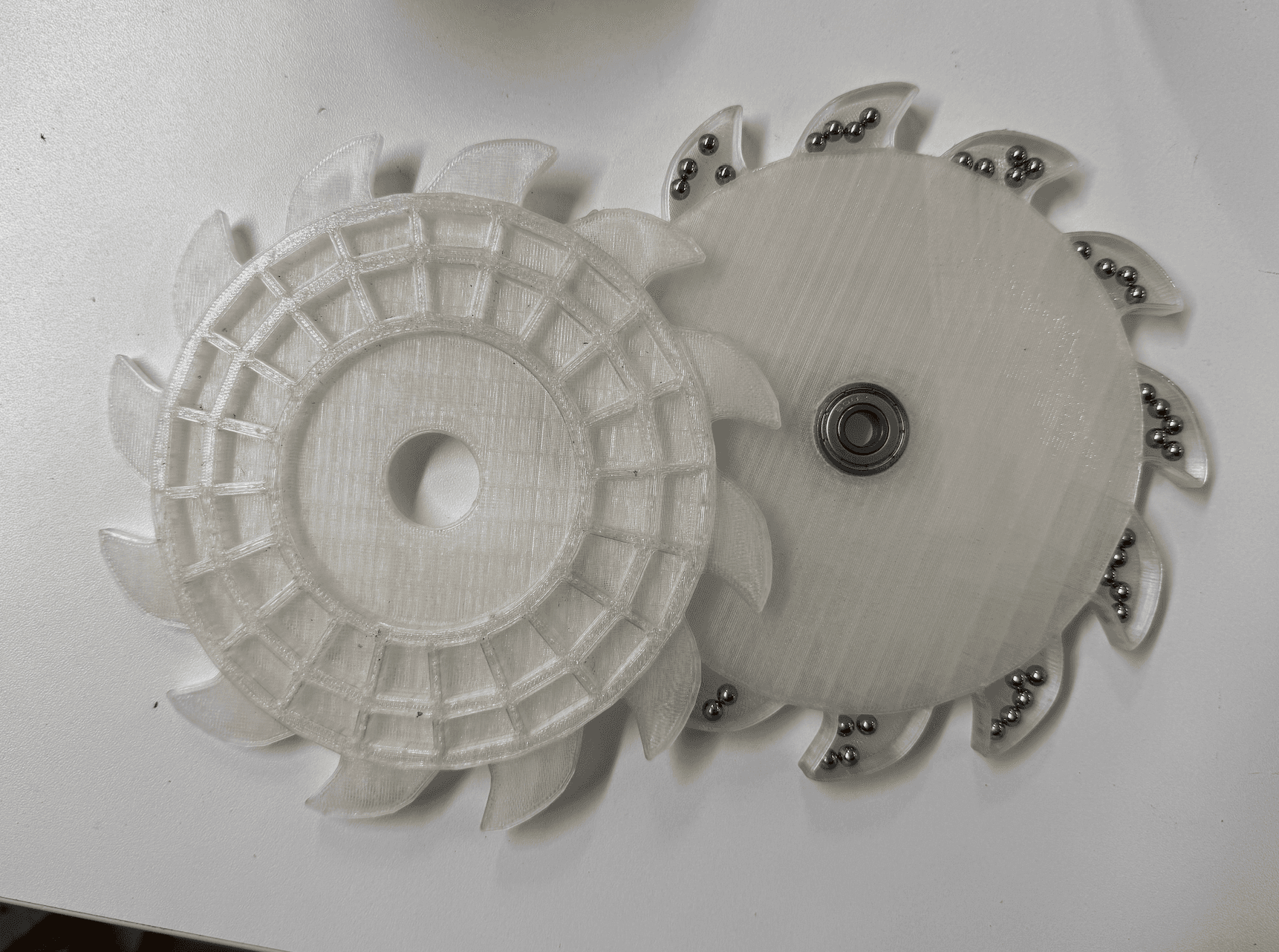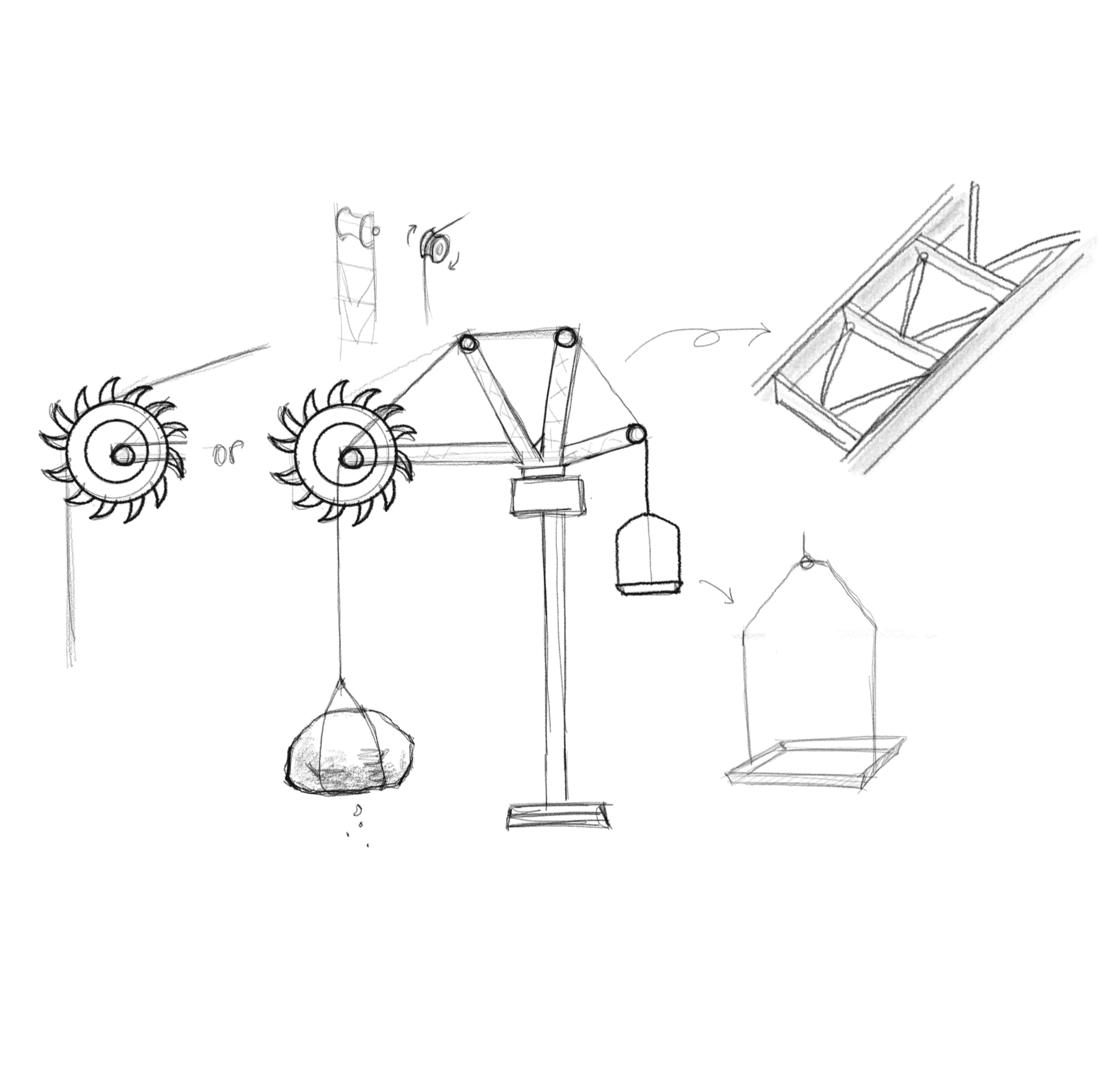 The arms holding the rock and tray were designed in Rhino 3D and laser-cut from 6 mm plywood (Figure 20). On the rock side, 3D-printed bucket-wheel props rotate slightly as the arm moves up and down. Steel balls were placed inside the buckets to produce a satisfying sound and to shift weight naturally, without requiring an additional motor (Figure 21).