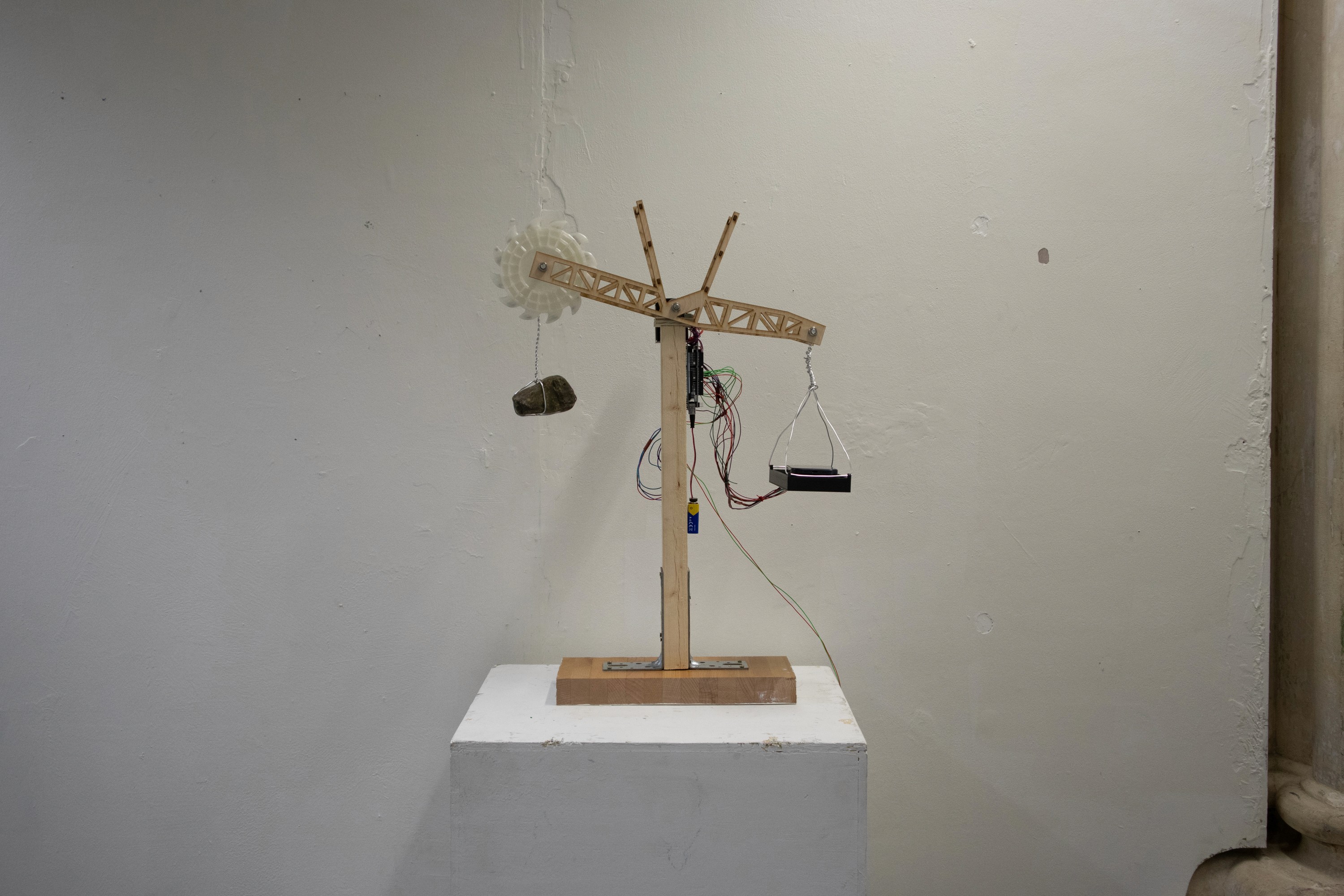 Based on this research and critical reflection, I decided to create an interactive scale installation. It takes the form of a traditional weighing scale. On one side, a rock hands as a counterweight, on the other side, a tray is provided for visitors to place an object. The visitor is invited to take their smartphone out of their pocket, place it on the tray, and observe what happens.